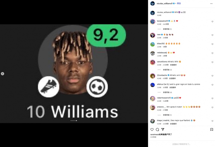 赛后,尼科在社媒晒照,其中有一张是自己本场评分9.2分。